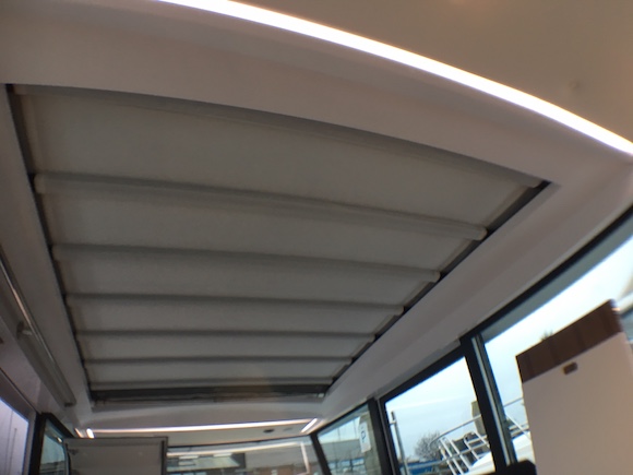 LAY-OUT AND SEATING: Walk-around cabin with aft cabin for 2 persons with twin flush Lewmar roof hatches, Large sliding side doors on both sides of cabin, Manually operated sliding canvas roof with additional harbour cover, L-sofa with fixed table and walnut floor on threshold, Two front seats with flip-up front/swivel function and armrests, Optional sundeck on fore deck, ”Silvertex” Beige or Meteor material on driver/co-pilot seats and aft sofa, Floor carpets in saloon and front cabin.