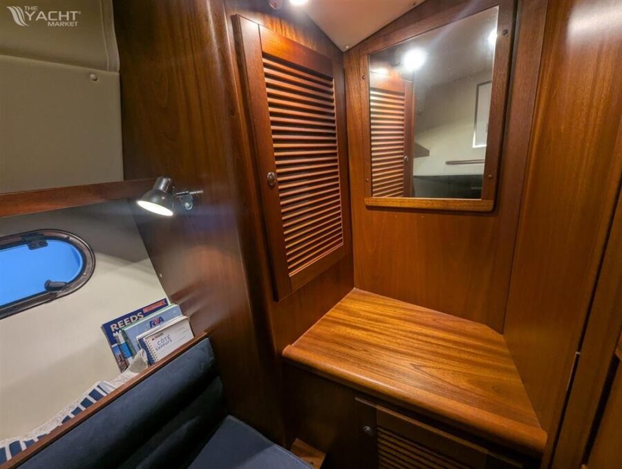 • Fore cabin with storage and cupboards, has two fitted sheets for large V shaped berth.